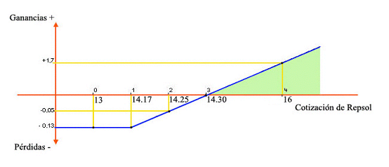 - Si cotiza a más de 14,30 euros, por ejemplo a 16, ejerceremos porque obtendremos ganancias: 16 - (Pe) - (Pr) = 1.7 euros.