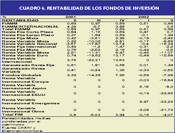 En el cuadro 6 se muestra la rentabilidad de los fondos de inversión hasta el último trimestre del 2002.