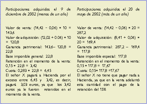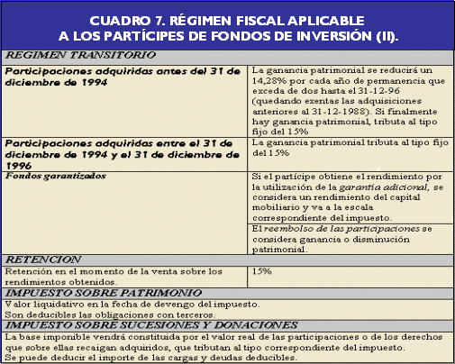Atención: El inversor también tiene que tener en cuenta que para el cálculo de las plusvalías por la venta de diferentes participaciones en un mismo fondo se aplica la regla FIFO (first in first out), es decir, que las primeras participaciones que entraron en cartera son las que primero se venden. La antigüedad de las participaciones del fondo tiene mucha trascendencia a la hora de pagar impuestos ya que las plusvalías obtenidas por la venta de las participaciones de su fondo están sujetas al pago del 15% de lo obtenido si ha pasado más de un año desde que se adquirieron. En caso contrario se debe pagar en función del importe que se obtenga y del resto de rentas que usted haya percibido a lo largo del año (rentas del trabajo, por intereses de sus cuentas, dividendos de acciones, etc) pudiendo pagar entre un mínimo del 15% y un máximo del 45%. Recuerde: la ganancia patrimonial obtenida por la venta de participaciones de fondos de inversión adquiridas antes del 31/12/1994, se reducirá un 14,28% por cada año de permanencia que exceda de dos hasta el 31/12/1996. Si finalmente existe ganancia patrimonial tributaría al tipo fijo del 15%. "No tributan las participaciones de fondos de inversión adquiridas con anterioridad a 31/12/1988". Si, por el contrario, tienen una antigüedad superior a un año se compensan con las ganancias patrimoniales que tengan un periodo de generación superior a un año y si en ese periodo no es posible, se extiende a los cuatros siguientes. Por otro lado desde el 1 de enero de 2003 si el importe obtenido del traspaso (reinversión total o parcial) de participaciones en IIC que tengan la consideración de fondos de inversión tiene como destino otros fondos o sociedades de inversión (SIM, SIMCAV), no se computarán la ganancia o pérdida patrimonial obtenida y las nuevas acciones o participaciones conservarán el valor y la fecha de adquisición de las traspasadas. En caso de reinversión parcial del importe obtenido en el traspaso, la ganancia o perdida se computará a efectos fiscales en la misma proporción. Consecuentemente, la retención se aplicará exclusivamente sobre el importe sujeto a tributación. Este régimen de diferimiento no resultará de aplicación cuando por cualquier medio se ponga a disposición del contribuyente el importe derivado de la transmisión de las participaciones. Desde un punto de vista fiscal, la tributación de los Unit Linked ha sido incierta debido a las dudas que se suscitaban con respecto a la finalidad que perseguía dicho producto. En el fondo, la problemática que subyacía era la de saber si el unit linked era un verdadero contrato de seguro o sí, por el contrario, se trataba de un producto financiero que, a través de fondos de inversión, permitía canalizar la inversión y gestionar patrimonios. La Dirección General de Tributos, a través de la Consulta vinculante de 30 de julio de 1999 y la Ley 55/1999, de 29 de diciembre, de Medidas fiscales, administrativas y de orden social, despejaron todas las dudas relativas a la tributación de estos productos considerando que en la medida en que se ajustasen a los requisitos establecidos legalmente tributarían como contratos de seguros, por lo que las prestaciones que se deriven de dichos contratos solo pueden estar sujetas al Impuesto sobre la Renta de las Personas Físicas, como rendimientos de capital mobiliario, o al Impuesto sobre Sucesiones y Donaciones. Las principales ventajas que se derivan de considerar a los Unit Linked como rendimientos de capital mobiliario son las siguientes: Los Fondos de inversión garantizados son Fondos de inversión que garantizan todo o parte del capital invertido, además de una rentabilidad mínima prefijada para un determinado período de tiempo. La rentabilidad suele ir ligada a la evolución de un índice bursátil. La diferencia con el resto de fondos radica en que en este tipo de fondos la rentabilidad de la inversión puede provenir de la garantía o de la transmisión de las participaciones. La Ley 40/1998 del IRPF a través de modificación introducida por la ley 46/2002 establece que los Fondos extranjeros tributan igual que los Fondos españoles convencionales siempre que cumplan determinadas condiciones: Por tanto y al igual que los partícipes de Fondos constituidos en España, aquellos partícipes de fondos extranjeros que cumplan los requisitos anteriores tendrán derecho a aplicar el régimen especial de traspaso sin cómputo fiscal, cumpliendo ciertos requisitos. Esto es consecuencia de que las pérdidas anteriormente citadas se pueden compensar con la propia base imponible general hasta un máximo del 10% (es decir, una persona con una base imponible de 30.050,61 euros podría compensarse hasta 3.005,06 euros por minusvalías de participaciones en fondos con una antigüedad inferior a un año). Esto es importante, porque en la medida que la base general tributa al tipo marginal, se podría recuperar (al pagar menos impuestos) hasta un 45% (tipo máximo de la escala de gravamen) de tales pérdidas, según el tipo marginal del inversor. Esto se debe a que los coeficientes reductores del 14,28% acumulados por cada año de antigüedad de las participaciones se aplican también sobre las plusvalías futuras que se puedan generar. Por ello, a la hora de reembolsar un fondo no hay que tener sólo en cuenta su tratamiento fiscal, sino que también hay que tener en cuenta la rentabilidad ofrecida por el producto con relación a otros de su categoría, la rentabilidad esperada para la familia de fondos en próximos años o el perfil de riesgo del inversor. Supuesto 2: Tributación de un fondo de inversiónEl señor X vende el 8 de noviembre de 2003, 30 participaciones de un fondo de inversión que tienen un valor liquidativo de 14,42 euros. El 20 de mayo de 2002 el señor X adquirió 20 participaciones por un precio de 8,41 euros la participación y el 9 de diciembre de ese mismo año adquirió 10 participacione