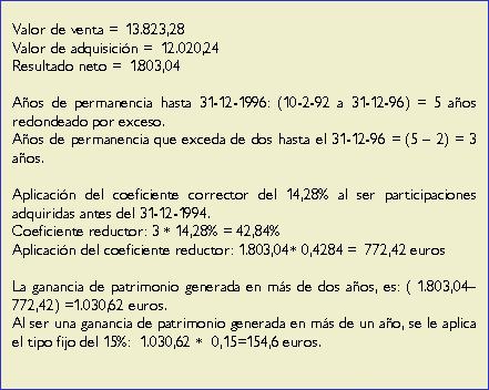 Supuesto 1: Supuesto de aplicación del régimen transitorioEl señor X suscribió participaciones en un fondo el 10 de febrero de 1992 por un importe de 12.020,24 euros y las vende el 1 de marzo de 2003 por 13.823,28 euros.13.8.- Supuestos prácticos de tributación de un fondo de inversión
