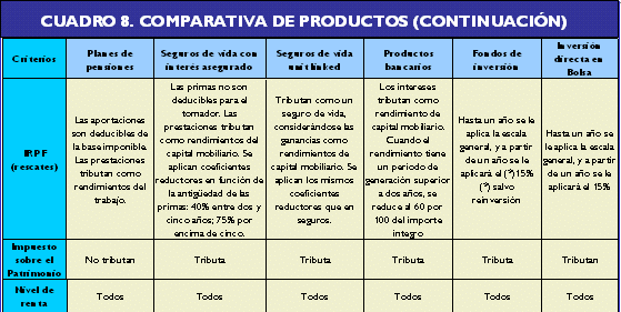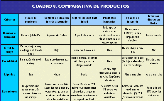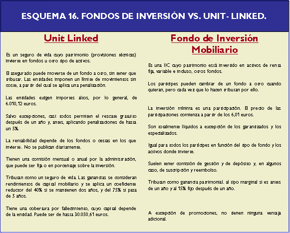 Desventajas: la principal desventaja de los fondos de inversión respecto a los fondos de pensiones estaba relacionada con la fiscalidad, pues anteriormente en los planes de pensiones se podía pasar de uno a otro sin tener que tributar, mientras que, en el caso de los fondos de inversión, si el inversor se quería pasar de uno a otro, tenía que pagar a Hacienda por las plusvalías obtenidas. Sin embargo, a partir del 1 de enero del 2003 los traspasos de posiciones entre fondos de inversión están exentos del peaje fiscal. En los planes de pensiones el inversor puede reducir su base imponible del IRPF, teniendo como límite con carácter general, 8.000 euros. La reforma parcial del Impuesto sobre la Renta de las Personas Físicas (Ley 46/2002) ha modificado de forma relevante la tributación de los partícipes de IIC. La pérdida o ganancia patrimonial obtenida con el reembolso o transmisión de las participaciones, no se computará fiscalmente en el IRPF, siempre y cuando, el importe obtenido del reembolso o la transmisión se destine a suscribir otras participaciones en Instituciones de Inversión Colectiva. Las nuevas participaciones conservarán el valor y la fecha de adquisición de las transmitidas o reembolsadas. Esta ventaja fiscal tendrá efecto, siempre y cuando el importe reinvertido sea el obtenido en el reembolso y no la cuantía de la ganancia o pérdida, en los siguientes casos:: Este régimen de diferimiento no resultará de aplicación cuando por cualquier medio se ponga a disposición del contribuyente el importe derivado del reembolso o transmisión de las acciones o participaciones. Por último destacar que el régimen de diferimiento fiscal explicado anteriormente será de aplicación a los fondos de inversión extranjeros y a las IIC con personalidad jurídica extranjeras siempre que cumplan determinados requisitos y bajo unas condiciones. En cuanto a los riesgos y rentabilidades que se pueden obtener, las consideraciones a efectuar son iguales para ambos y dependerán del tipo de fondo en que se invierta el dinero. Desventajas: los seguros de vida tienen un nivel de riesgo bajo frente a los fondos de inversión, en la medida que en los primeros se conoce de antemano la rentabilidad que se obtendrá. Además, a largo plazo las reducciones fiscales que tienen los seguros de vida son superiores. Desventajas: si bien para desinversiones definitivas las ventajas fiscales de los unit- linked pueden ofrecer tributaciones efectivas inferiores al 15% (tributación mínima de los Fondos), para aquellos particulares que pretendan reestructurar sus inversiones, la posibilidad de realizar traspasos entre fondos sin coste fiscal puede representar una ventaja de éstos frente a los unit-linked. En estos últimos, existen en algunos casos un elevado coste al efectuar múltiples traspasos. Otra desventaja de los fondos de inversión es que los unit-linked incorporan cobertura por fallecimiento. Desventajas: con la reforma parcial del Impuesto sobre la Renta de las Persona Físicas (Ley 46/2002 de Reforma Parcial del IRPF), los depósitos a más de dos años han visto mejorado su tratamiento fiscal, de tal forma que para algunos niveles de renta pueden ser más interesantes que los fondos. A partir de dos años, las rentas obtenidas por la tenencia de depósitos tienen una reducción del 40% antes de imputarlas en la base, mientras que las de los fondos tributarían al 15%. Así los titulares de depósitos con más de dos años de antigüedad sólo tributarán por el 60% de los intereses que reciban y de esta forma los depósitos a plazo verán impulsada su importancia, ya que junto a la reducción anteriormente comentada la retención sobre rentas de capital se reduce del 18% al 15%. Desventajas: una desventaja de los fondos de inversión respecto a la inversión directa en Bolsa es que, con la reforma parcial del IRPF (Ley 46/200), las plusvalías obtenidas por la venta de participaciones en fondos sufren una retención del 15% en el momento del reembolso (es decir, se trata de un pago a cuenta del impuesto), mientras que en la venta de acciones no existe retención alguna. Las ventajas y desventajas anteriormente comentadas se pueden ver, de forma clara, en el cuadro 8, ya que se pueden apreciar las principales características de los distintos productos comentados para que resulte más fácil la comparación entre ellos: