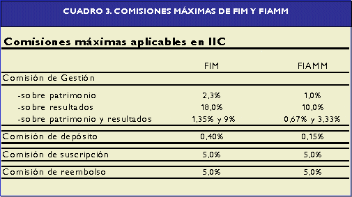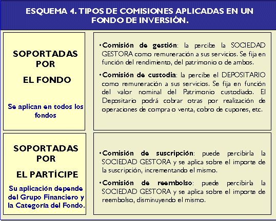 Las comisiones son el coste que tiene la colocación del ahorro en fondos de inversión, es decir, es la remuneración que obtienen las sociedades gestoras y los depositarios por los servicios que prestan. Existen dos grandes grupos de comisiones, las soportadas por el fondo y las soportadas por el partícipe (Véase Esquema 4). En el apartado de clasificación de fondos de inversión se incluye el cuadro donde se pueden ver las distintas comisiones aplicadas a FIM y FIAMM (Cuadro 3).