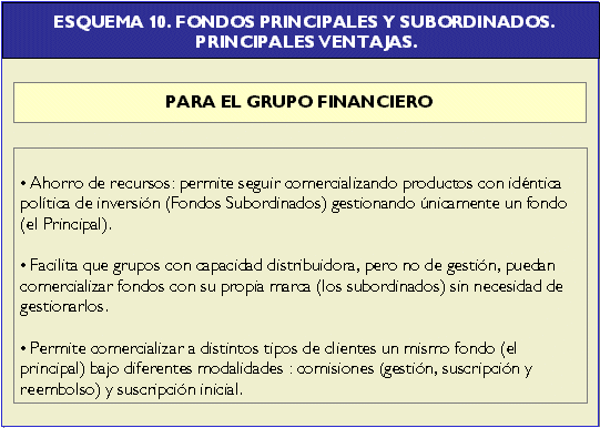 Fueron creados en febrero de 2001, a través del Real Decreto que modificó parcialmente el Reglamento de las Instituciones de Inversión Colectiva (IIC), con el fin de racionalizar y flexibilizar, de cara a las gestoras, la operativa y la gestión de los fondos. Con estos productos lo que se pretende es simplificar y racionalizar los costes de gestionar diferentes fondos con carteras muy semejantes, que en muchos casos pertenecerían a un mismo grupo financiero. En cuanto al aspecto fiscal, no comportan ningún tratamiento específico diferente. Bien es cierto que, al hablar de un fondo principal y varios subordinados, podría pensarse en los