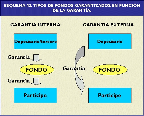 Las figuras que se han comenzado a comercializar inicialmente son los Fondos de Fondos y los Fondos Principales y Subordinados, cuya estructura y ventajas se analizan en los Esquemas 7, 8, 9 y 10. Nótese que en el caso de los Fondos de Fondos las ventajas que aportan estas figuras son exclusivamente para las entidades. Por tanto, es necesario disponer de una clasificación de los fondos de inversión que permita comparar fondos con combinaciones de rentabilidad-riesgo similares. A partir de mediados de 1999, la CNMV e INVERCO empezaron a utilizar nuevas categorías y criterios de clasificación de los fondos de inversión, basadas en la vocación inversora del fondo. En el Esquema 11 se muestran estas categorías de fondos, con las últimas ampliaciones realizadas en el 2002, en función de las características de los activos en los que se materializa la inversión y la divisa de los mismos. No obstante, esta no es la única categoría analítica de fondos existente en el mercado, otras instituciones cuentan con clasificaciones diferentes, en función de los criterios de selección escogidos (ver anexo 1 tabla clasificación AFI). Los activos en los que se materializa la inversión son principalmente de renta variable y, en menor medida, en renta fija (bonos). Desde el punto de vista de las monedas en las que invierte el fondo, se puede hablar de fondos en divisas. Existen dos clases de fondos garantizados, en función de si la garantía es externa o interna. En las IIC con garantía externa, la rentabilidad del partícipe a vencimiento del fondo queda garantizada por el depositario (entidad financiera). Por otro lado, en los fondos con garantía interna, el depositario del fondo, o un tercero, garantizan una rentabilidad al propio fondo y, por tanto, a todos los partícipes del mismo (Véase Esquema 13) La diferencia para los partícipes es, en primer lugar, de carácter fiscal: para aquellos partícipes que obtengan la rentabilidad garantizada directamente de un tercero (fondos con garantía externa), el rendimiento obtenido tributará como un rendimiento de capital. En el caso de que la rentabilidad garantizada se obtenga a través del fondo, el rendimiento tributa como una variación patrimonial. En segundo lugar, todos los partícipes de un fondo con garantía interna cuentan con una rentabilidad garantizada, independientemente de cuando hayan suscrito sus participaciones. En un fondo con garantía externa únicamente los partícipes que adquiriesen sus participaciones durante el periodo de suscripción cuentan con una rentabilidad garantizada, para el resto de partícipes el fondo es un FIM sin rentabilidad garantizada. En caso de que surja la necesidad de rescatar el dinero invertido en las participaciones, antes de la finalización del plazo, el partícipe se vería obligado a atender elevadas comisiones. Así mismo, la solicitud de un reembolso anticipado de las participaciones, supone la liquidación de las mismas al valor que tengan en ese momento en el mercado, minoradas por las comisiones estipuladas por el fondo. Los fondtesoros aparecieron en 1990, como variantes de los FIM o FIAMM, y con la finalidad de promover que las familias inviertan en Deuda Pública a través de instrumentos de Inversión Colectiva. A mediados de 1999, y dada la escasa rentabilidad obtenida por este tipo de fondos, el Tesoro introdujo la posibilidad de que los fondtesoros invirtieran en renta fija privada y en renta variable, tratando de hacer más atractivos estos productos. Su principal objetivo es desligarse de la evolución de los mercados, por lo que suelen tener niveles de riesgo algo inferiores a los fondos de renta variable, pero superiores a los fondos de renta fija.