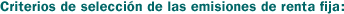• Siempre son de emisores de reconocido prestigio. • El rating que les otorga un experto independiente, Standard & Poor´s o Moody´s. • Las emisiones seleccionadas tendrán un vencimiento entre 1 a 30 años y se pueden comparar con emisiones representadas en la curva de tipos de interés. La inversión mínima está definida para cada tipo de emisión. |